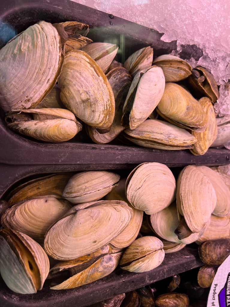 I haven’t had them in a long time and I still didn’t have steamed clams this trip to Massachusetts. But I saw them at the fish counter at the restaurant we went to, Jake’s Seafood Restaurant and Fish Market, at Nantasket Beach, just south of Boston. (If you’re around, it’s quite good.)