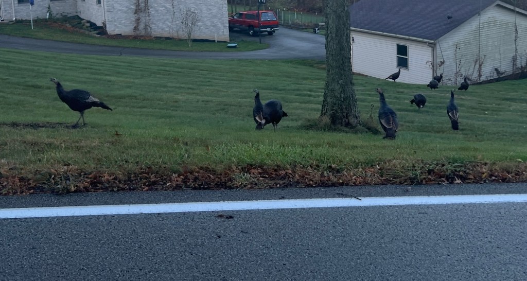 Seen on my drive, a bunch of turkeys who don’t know that Thanksgiving is coming soon.